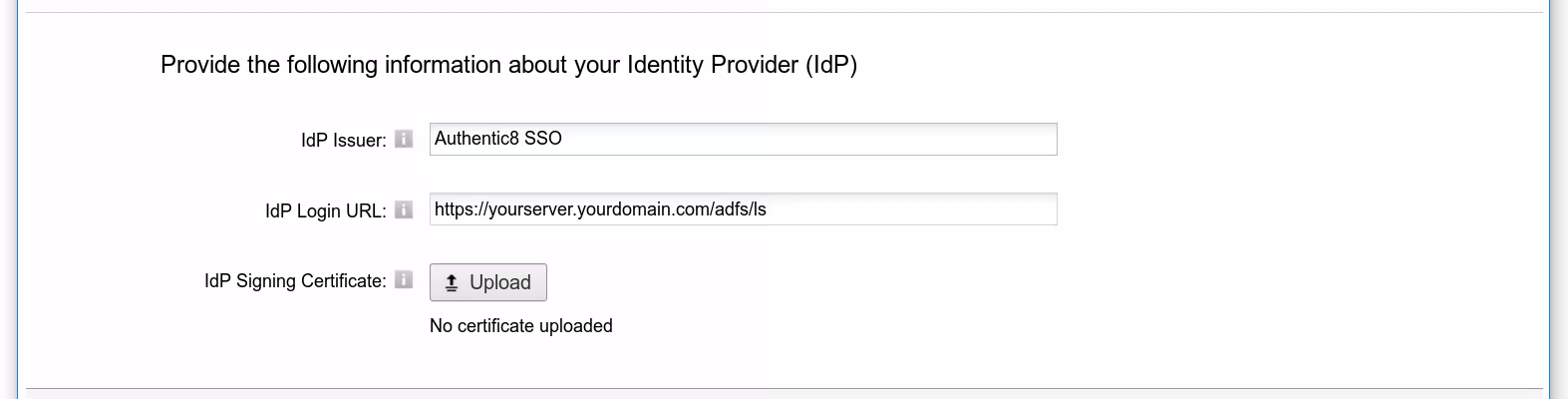 - Authentic8 may have additional configuration support for other IdPs, which can be requested by contacting Support.