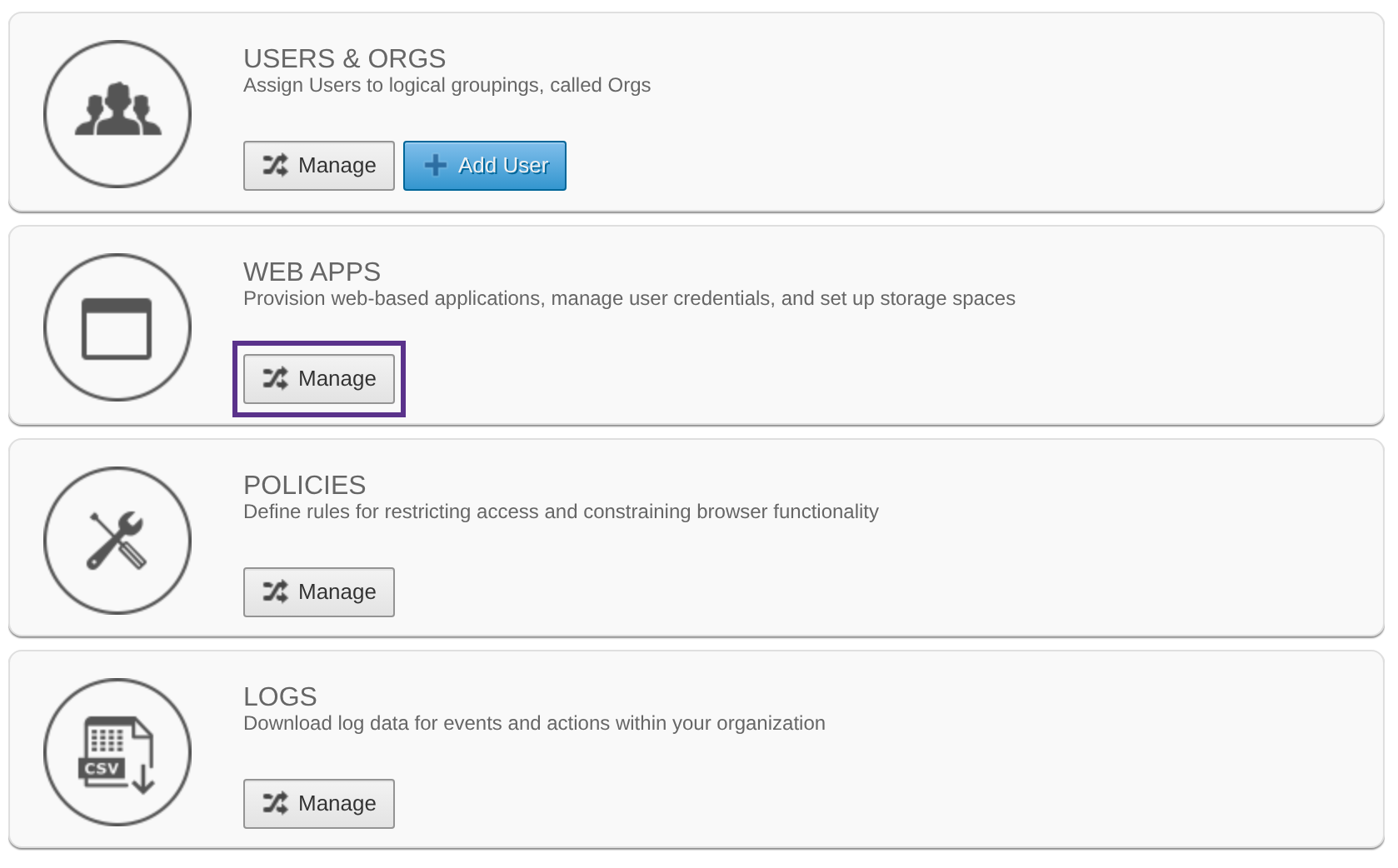 From the Silo Admin Console, click Manage right below Web Apps